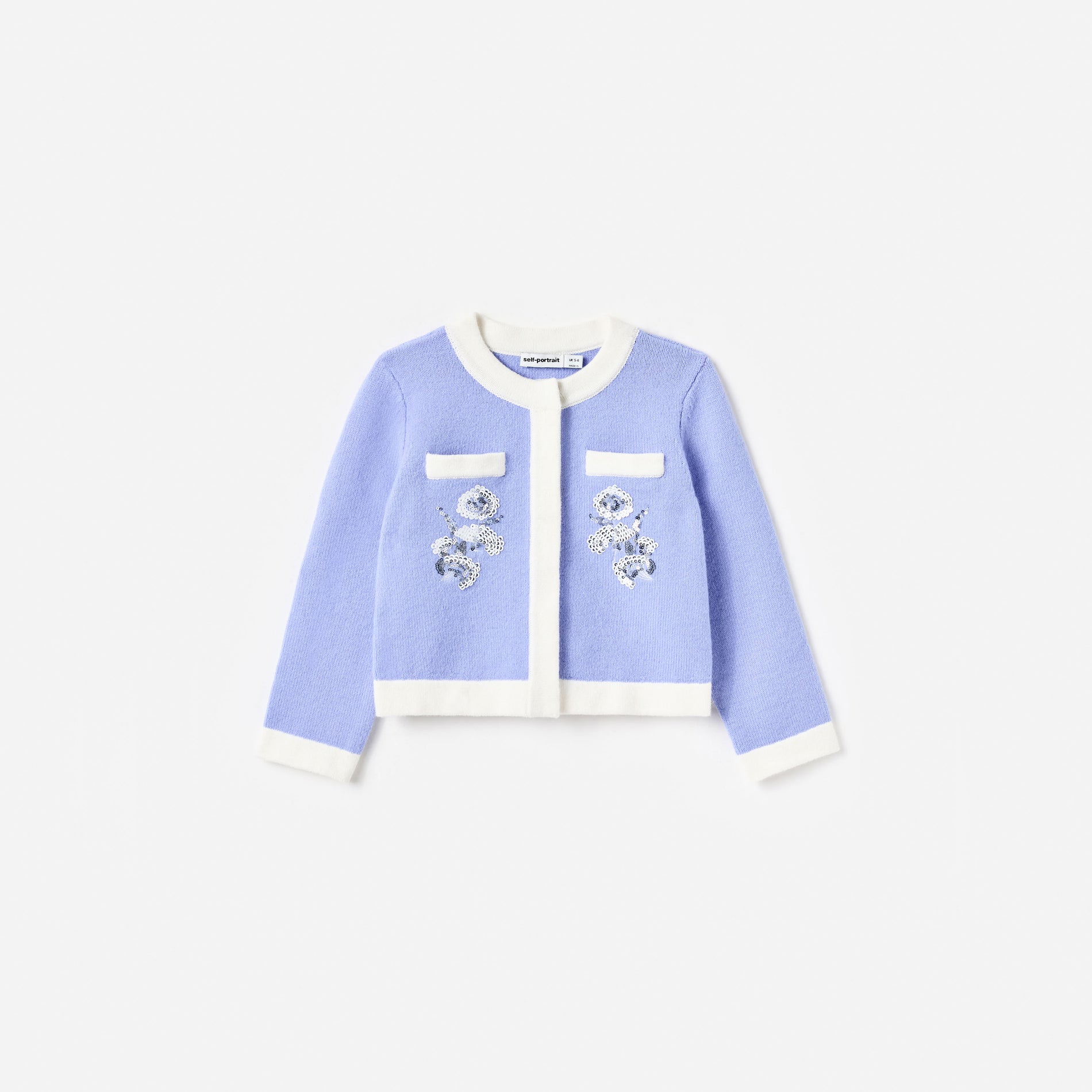 A preppy classic with a touch of sparkle, this baby blue knit skirt boasts contrast trims and sequin flower embroidery. Complete the look with our matching cardigan and bedazzled headband.