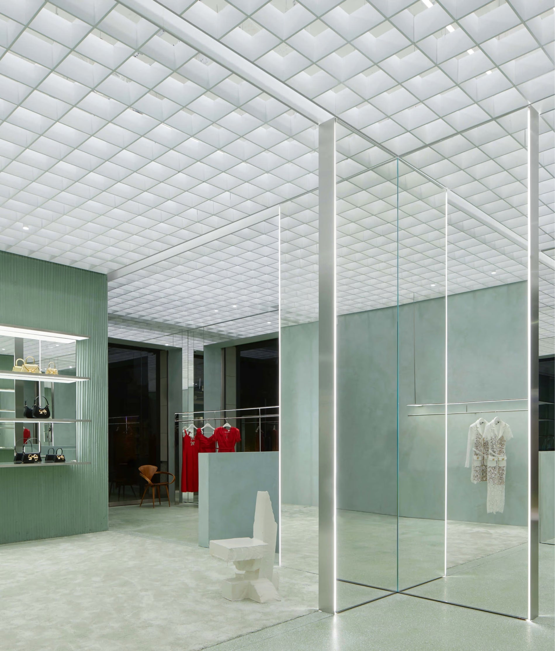 With a focus on the juxtaposition between the effortless and the studied, architect Andreas Kostopoulos, founder of MP NYC, designed the store with minimalist architectural designs that contrast against the rich interior. The space features a unique combination of textures which dominate the walls, with tonal surfaces presented in vivid mint green.
