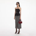 This top marries the sultry, décolletage-baring appeal of a bandeau neckline with a tailored silhouette in bonded crepe. Match its diamanté buttons with our statement earrings for full impact.