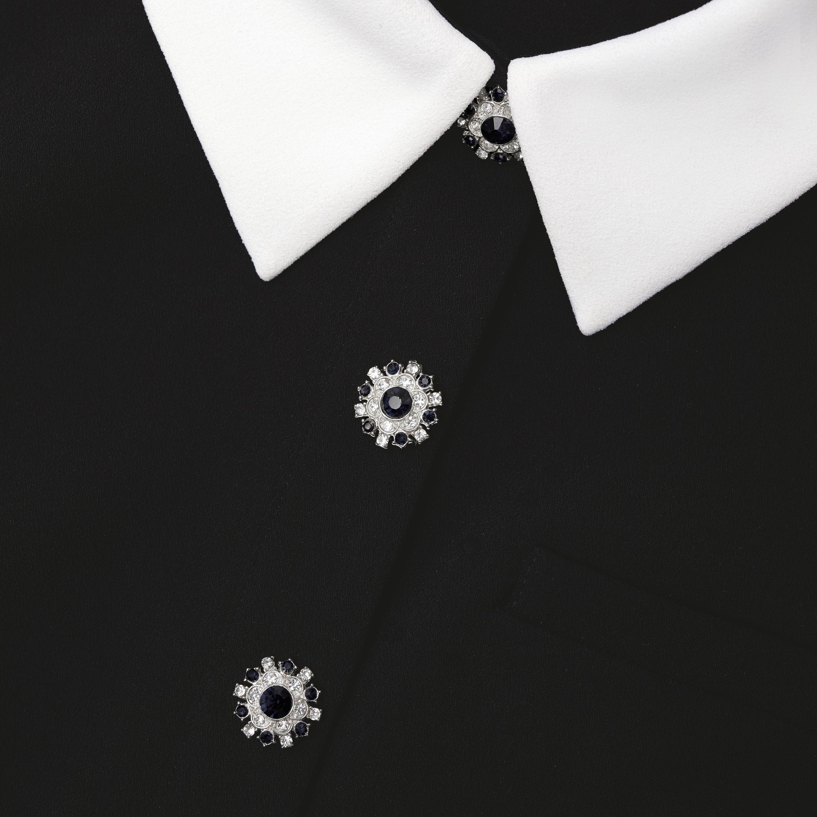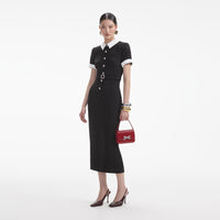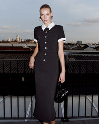 Cut from crepe for its buttery smooth feel, this midi dress — with its prim white accents and diamanté accents — is a lesson in tailored chic. Pair with statement heels for after-work drinks.