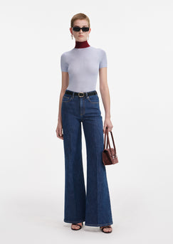 A contrast high neck gives preppy detail to this blue viscose knit top. Fitted to flatter, layer under a blazer and jeans for the office or amp it up with a leather mini and heels for date night.