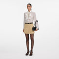 A pussy bow neck tie brings irresistible glamour to this cream and gold chiffon blouse. Style with a leather mini for date night, and match its gold buttons with a pair of our statement earrings.