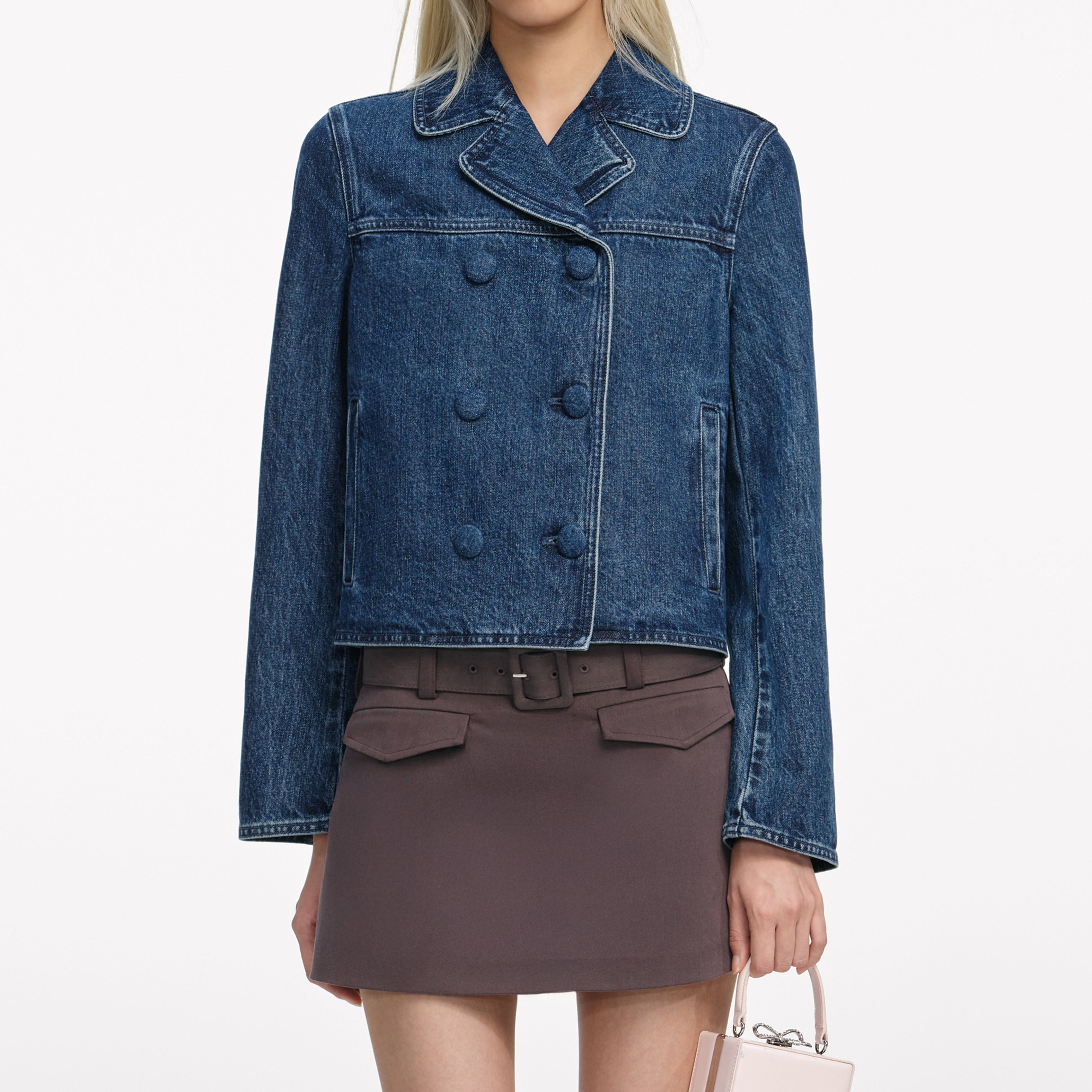 A double breasted design adds tailored detail to this denim jacket. Fitted to flatter, style with trousers for meetings that matter or switch it up with a leather mini and boots for dinner dates.