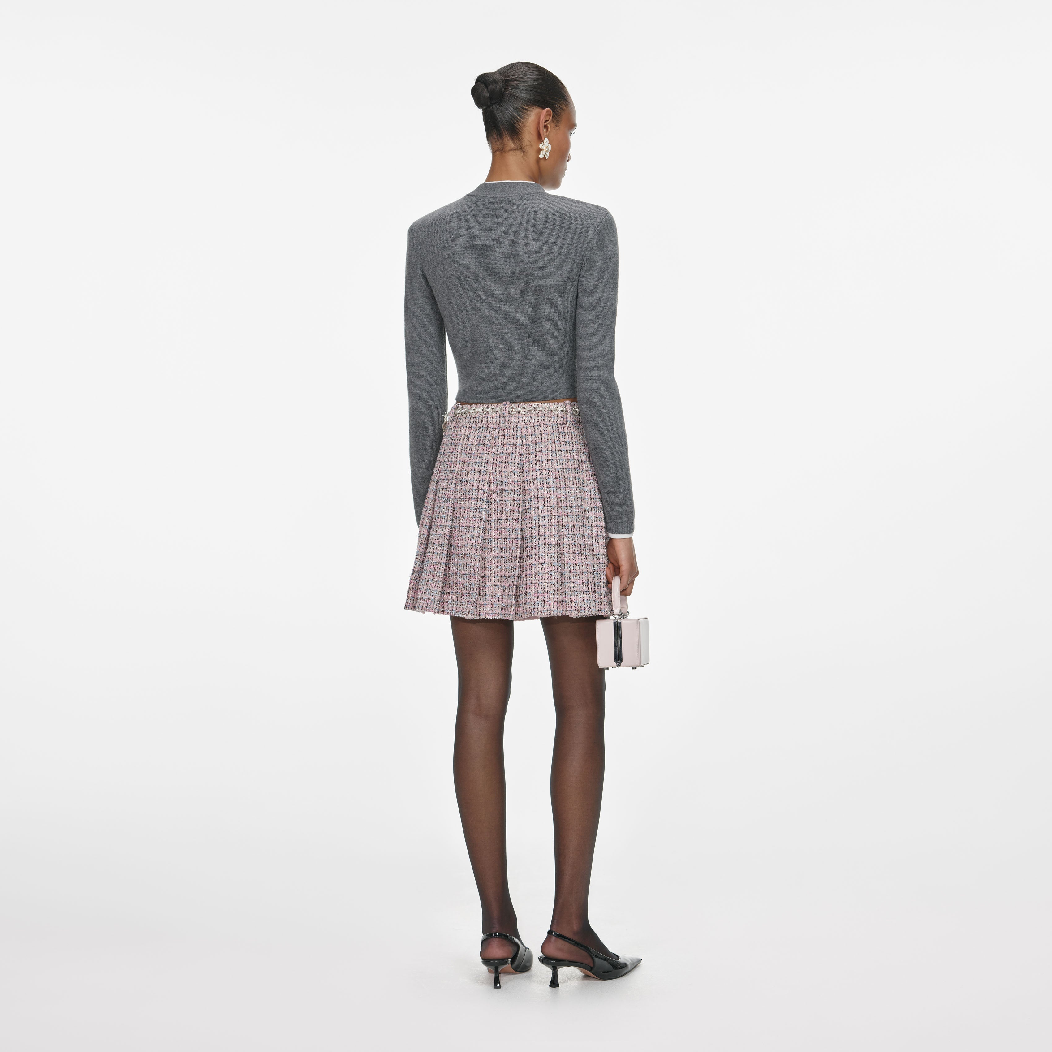 A new take on prep, this grey wool cashmere cardigan boasts contrast trims and a crochet flower motif for added romance. Style with a pencil skirt for work or wear with jeans for weekend brunch.