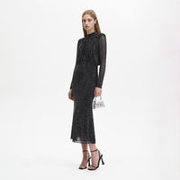 Make a sparkling statement in this updated version of the LBD. Cut from black rhinestone mesh, the statement making silhouettes comes with the additional benefit of an ultra-comfortable fit. High neck and long sleeves offer an elegant touch, whilst slight blouson detailing on the top tapers into the fitted waist and a flared midi skirt. Grab a matching Bow Bag, and you're all set for a night out on the town. Check the Size Guide to find your perfect fit.