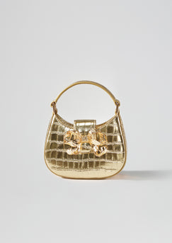 Lustrous in embossed mock croc, this gleaming micro bag marries an elegant silhouette with a futuristic finish. Crafted from gold leather for a smooth, structured finish, it has a timeless curved shape and the pièce de resistance: a statement gold bow. Pair it with your favourite LBD and stilettos for the perfect after-dark ensemble.