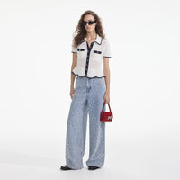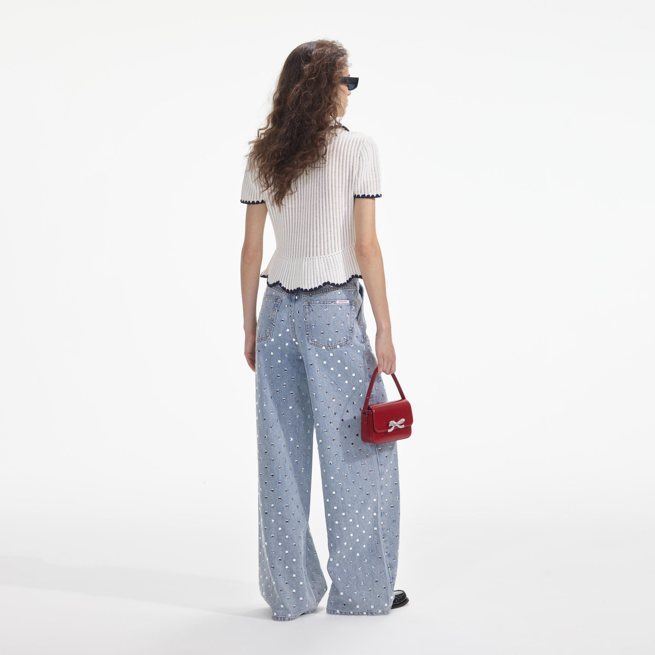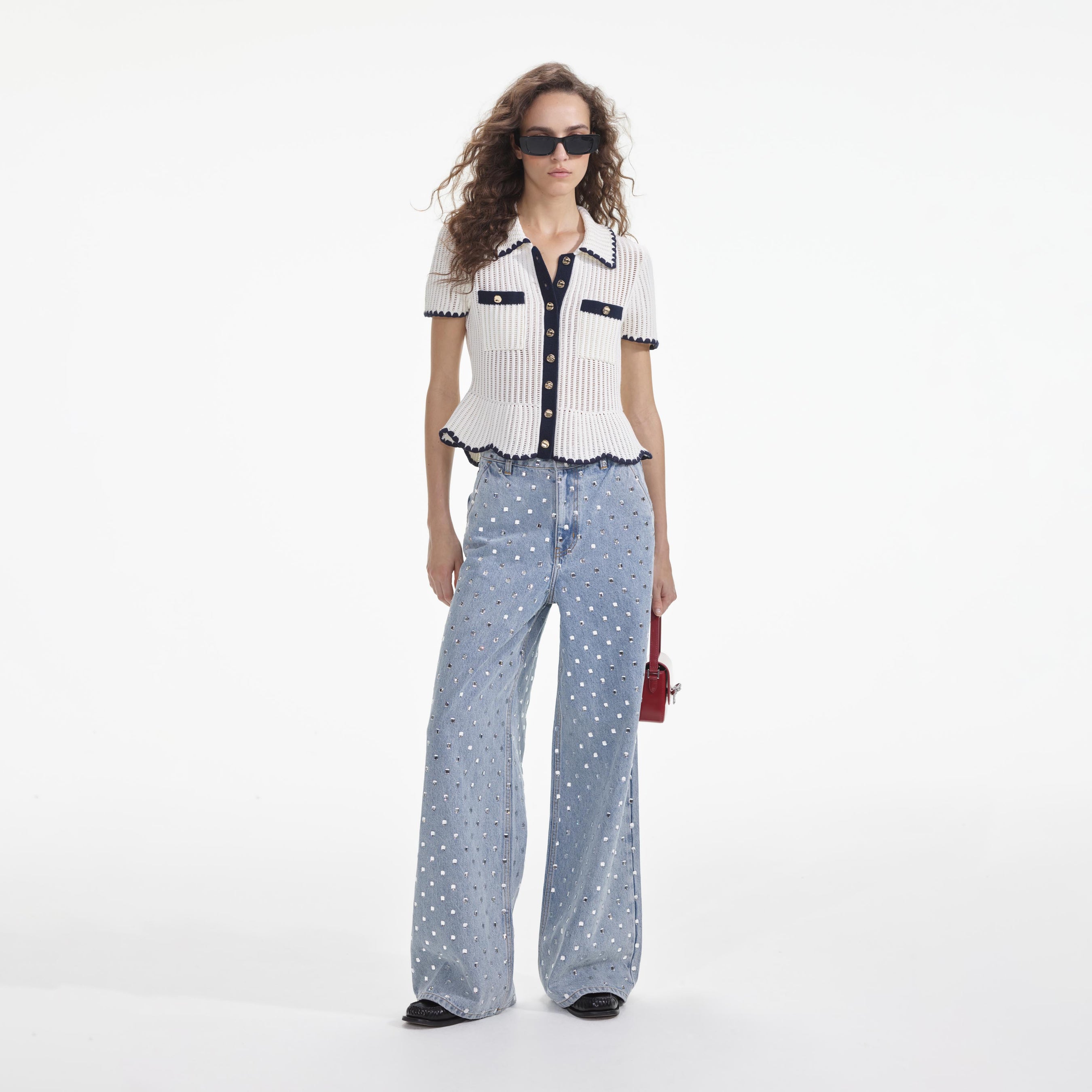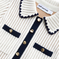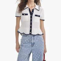 A summer favourite, this top is cut from crochet for its relaxed charm. With navy contrast trims and a scalloped hem, lean into its preppy details by pairing with denim for weekend brunch.