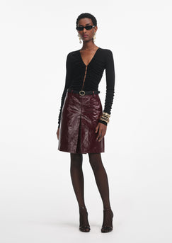 A plunging V-neck and hook & eye closures lend extra sensuality to this sheer viscose knit. Gathering detailing sculpts the form with barely-there appeal – style with minis and baggy denim alike.