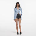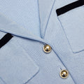 A fitted longline silhouette makes this blue ribbed viscose knit an effortless styling piece. Gold buttons and flared sleeves add elegant detail – wear it over micro shorts and maxi skirts alike.