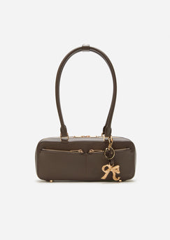 Elongated shoulder straps meet a classic boxy silhouette in this brown leather bag. Functional front pockets hold all essentials, whilst a detachable gold bow keyring adds extra charm.