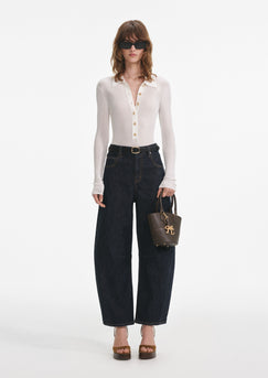 Sheer sensuality comes with this burgundy viscose knit bodysuit. A standout layering piece, its collar detail is framed by shining gold buttons – wear with a leather mini and heels for date night.