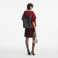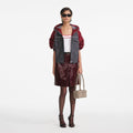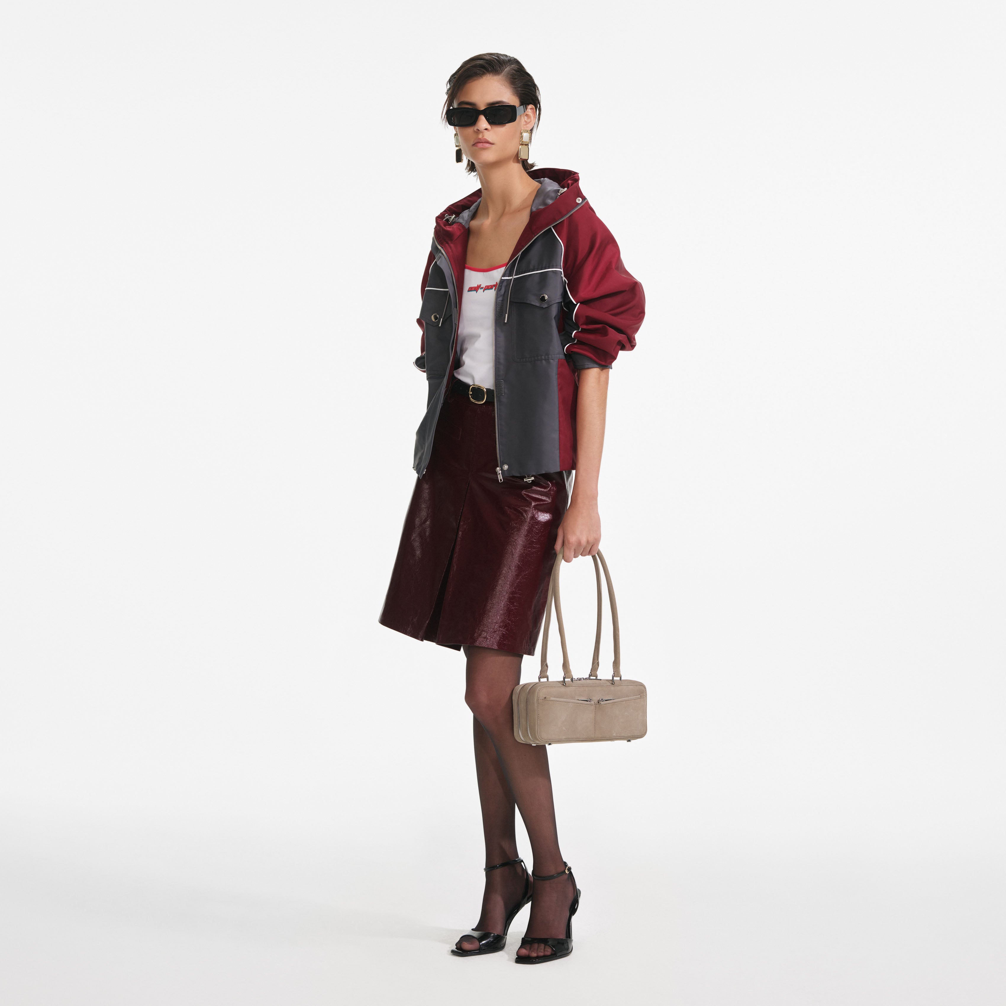 Sporty meets chic in this grey & burgundy nylon windbreaker, which boasts athletic details like an exaggerated hood and elasticated waist. Style it over a t-shirt and micro shorts for date night.