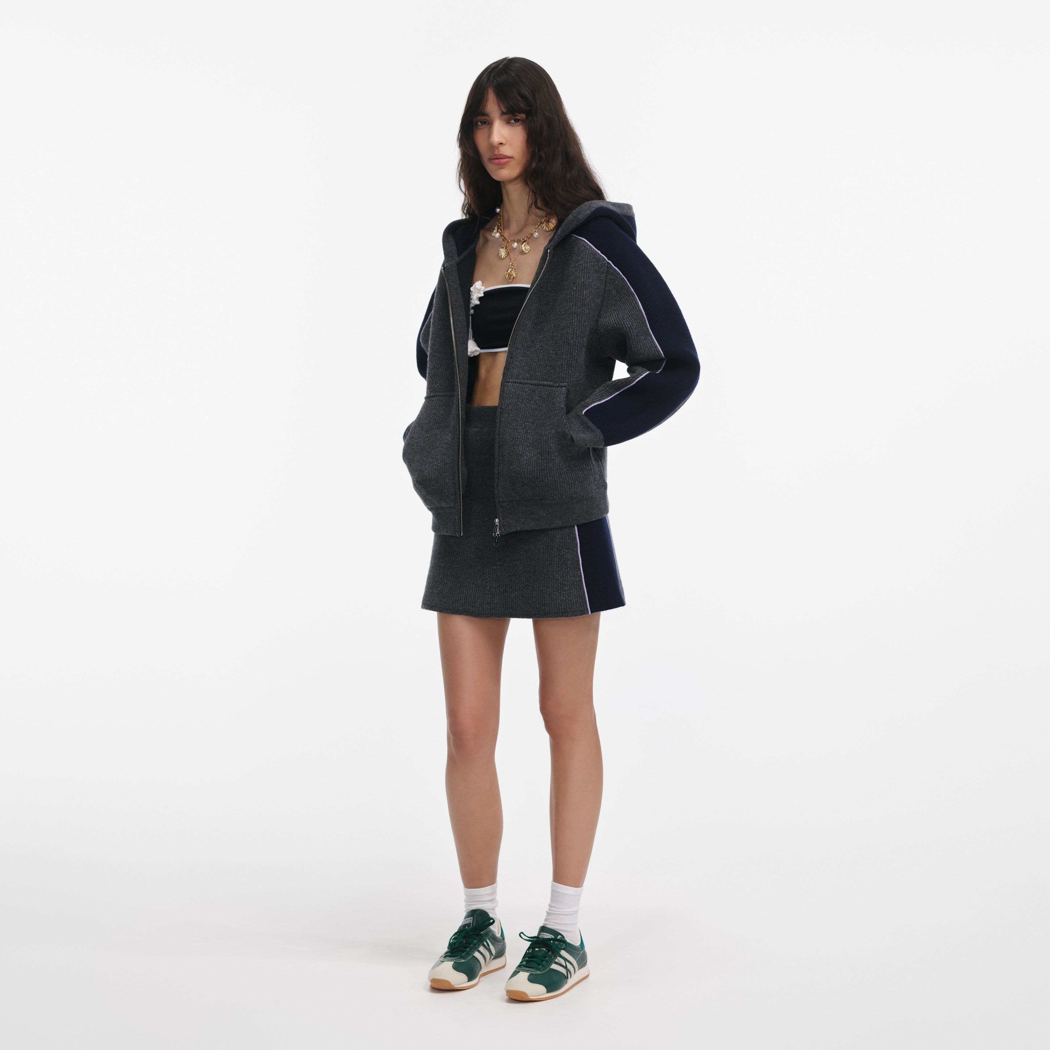 Comfort and style unite in this grey ribbed knit skirt, which boasts a flared mini hem. Add our matching hoodie for an effortless day look or switch to a crop top and heels for girls’ night out.