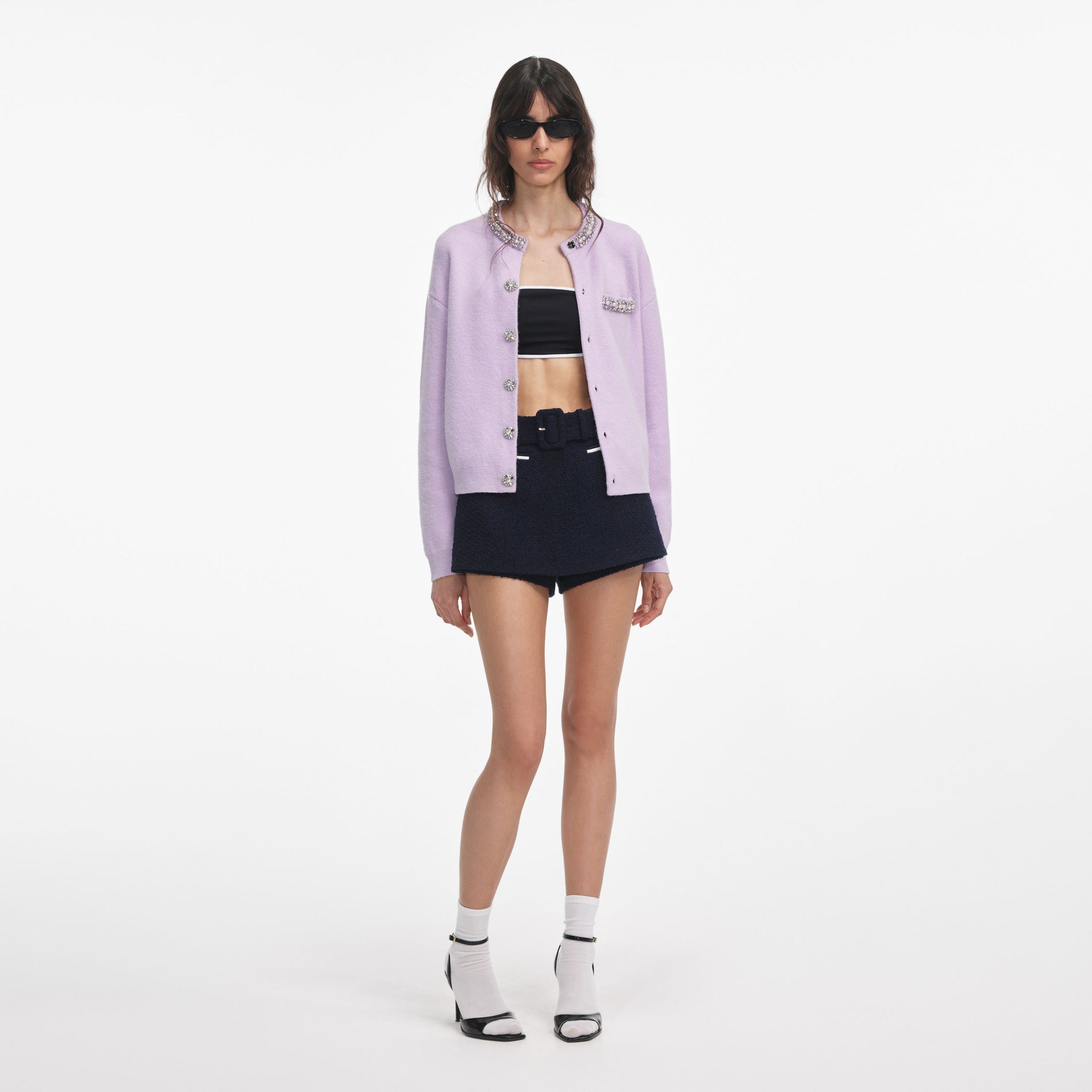 The best things in life feature the softest knit and sparkling diamanté. Embrace a pop of colour with this lilac alpaca mini skirt and style with the matching cardigan for the full effect.