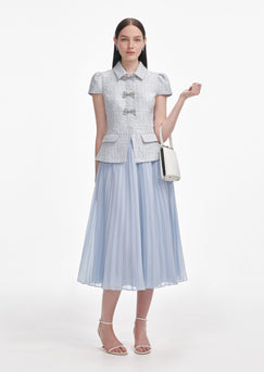 A lesson in elegant contrasts, this dress marries the soft structure of pink tailored bouclé with a featherweight chiffon midi skirt. A peplum waist and diamanté bows are the cherries on top.