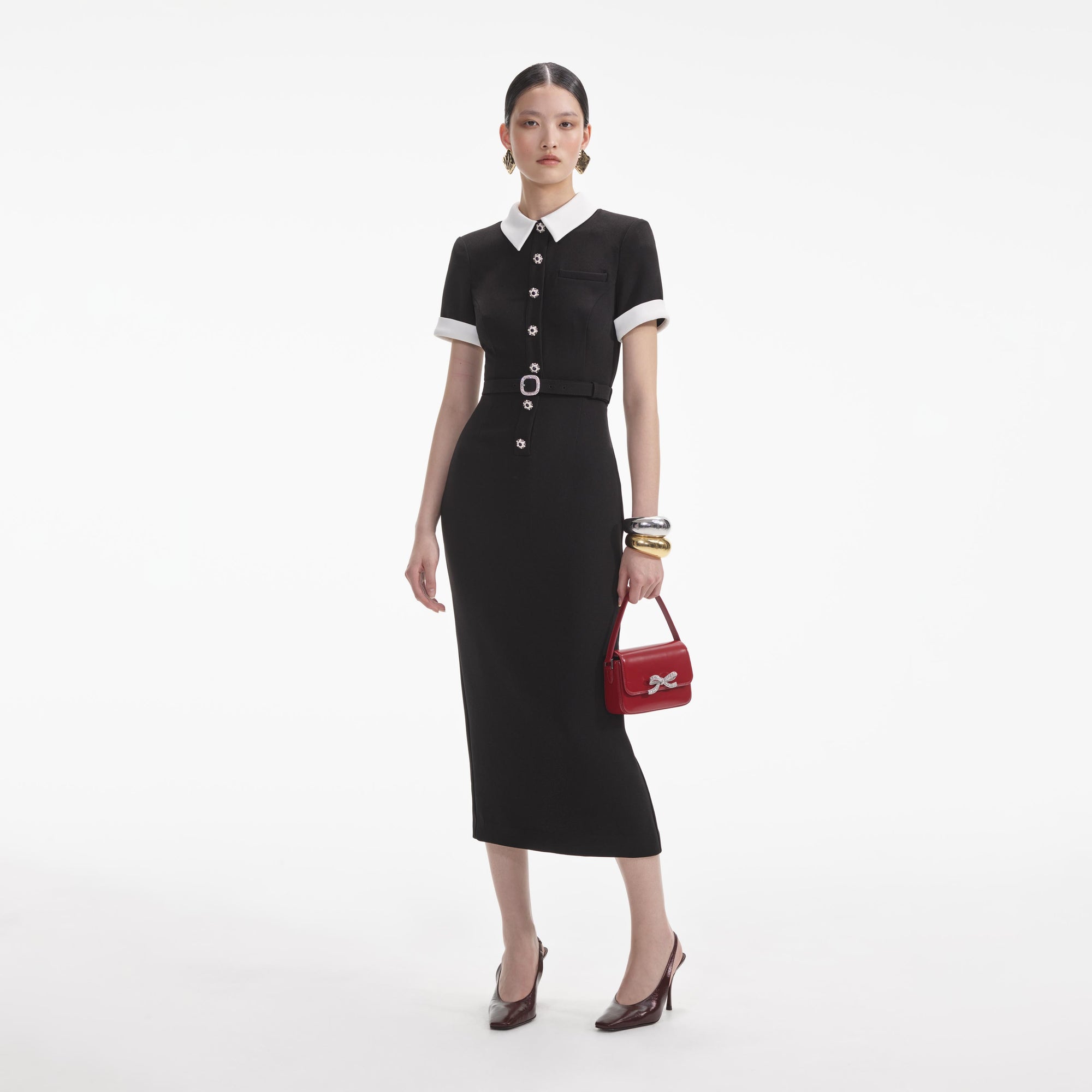 A house signature distilled to perfection, this crepe midi dress is designed to flatter, from its square neckline to sculpted skirt. Style with our statement earrings for invite-only occasions.