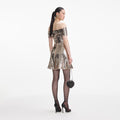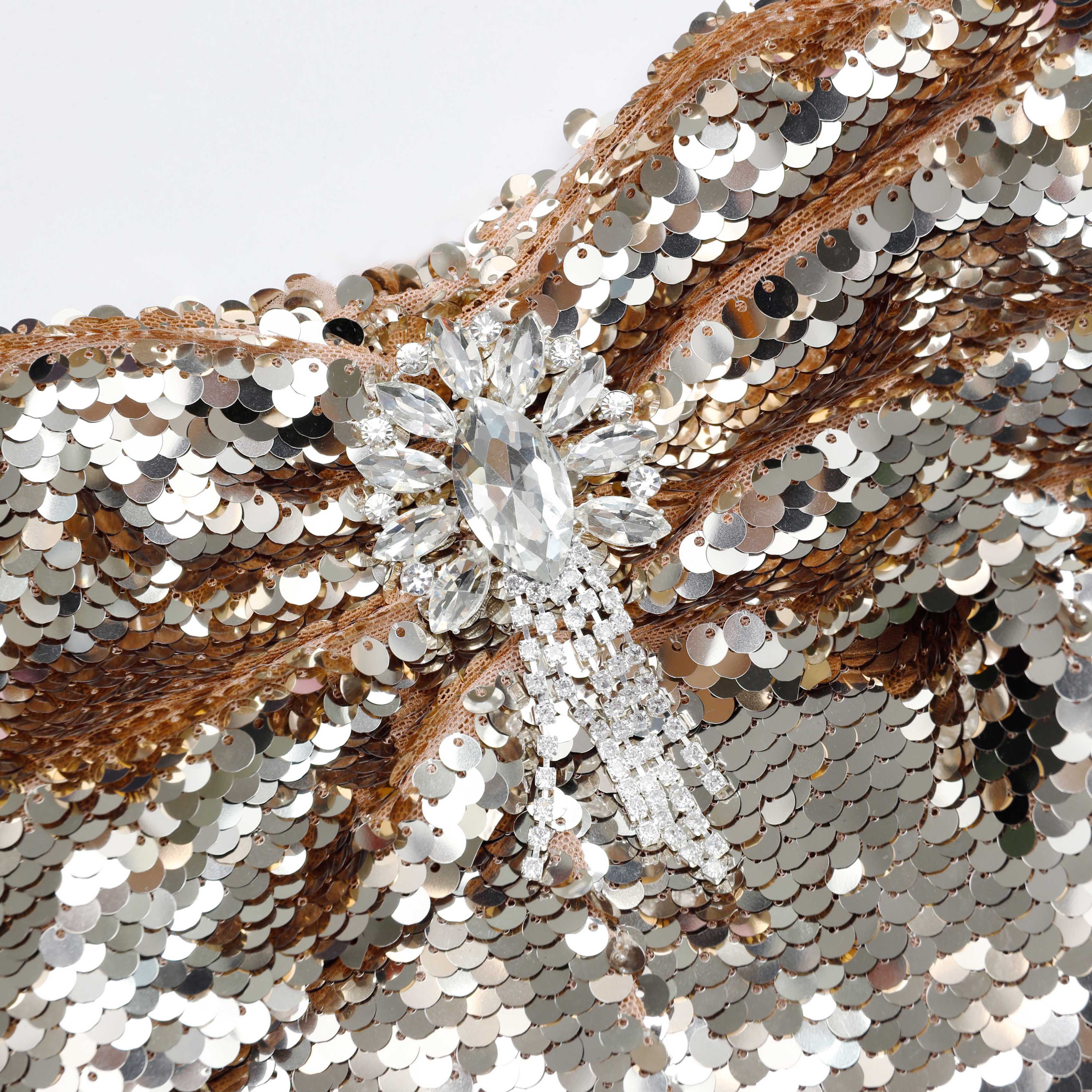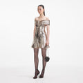 A party look for the ages, this dress' off-shoulder neckline and flared skirt let its liquid-like gold sequins and diamanté brooch do the talking. Add extra shine with our statement earrings.
