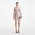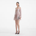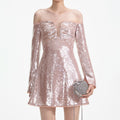 Dripping in beige sequins, this dress' plunging off-shoulder neckline and flared skirt let its high-shine finish do the talking. Match its sparkle with heels and a pair of our statement earrings.