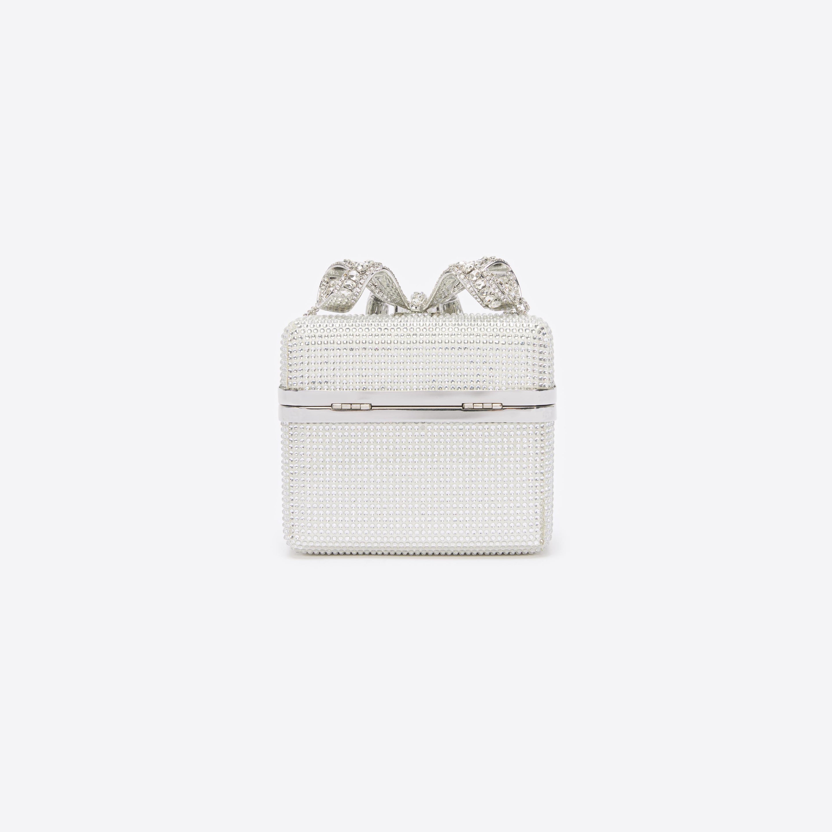 Awash in silver rhinestones for a light-catching finish, this vanity bag is topped with a flowing diamanté bow dripping with more gems. Pair it with an LBD and heels for your next night out.