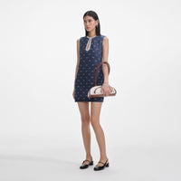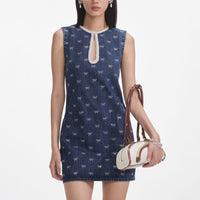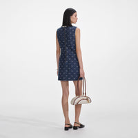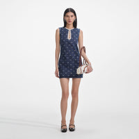 A retro silhouette meets cool blue denim in this shift dress, which stars an eye-catching diamanté bow print. Match its pearl trims with our statement earrings and wear with boots or heels alike.