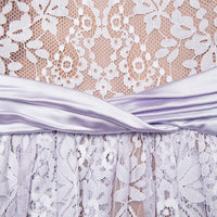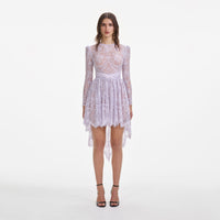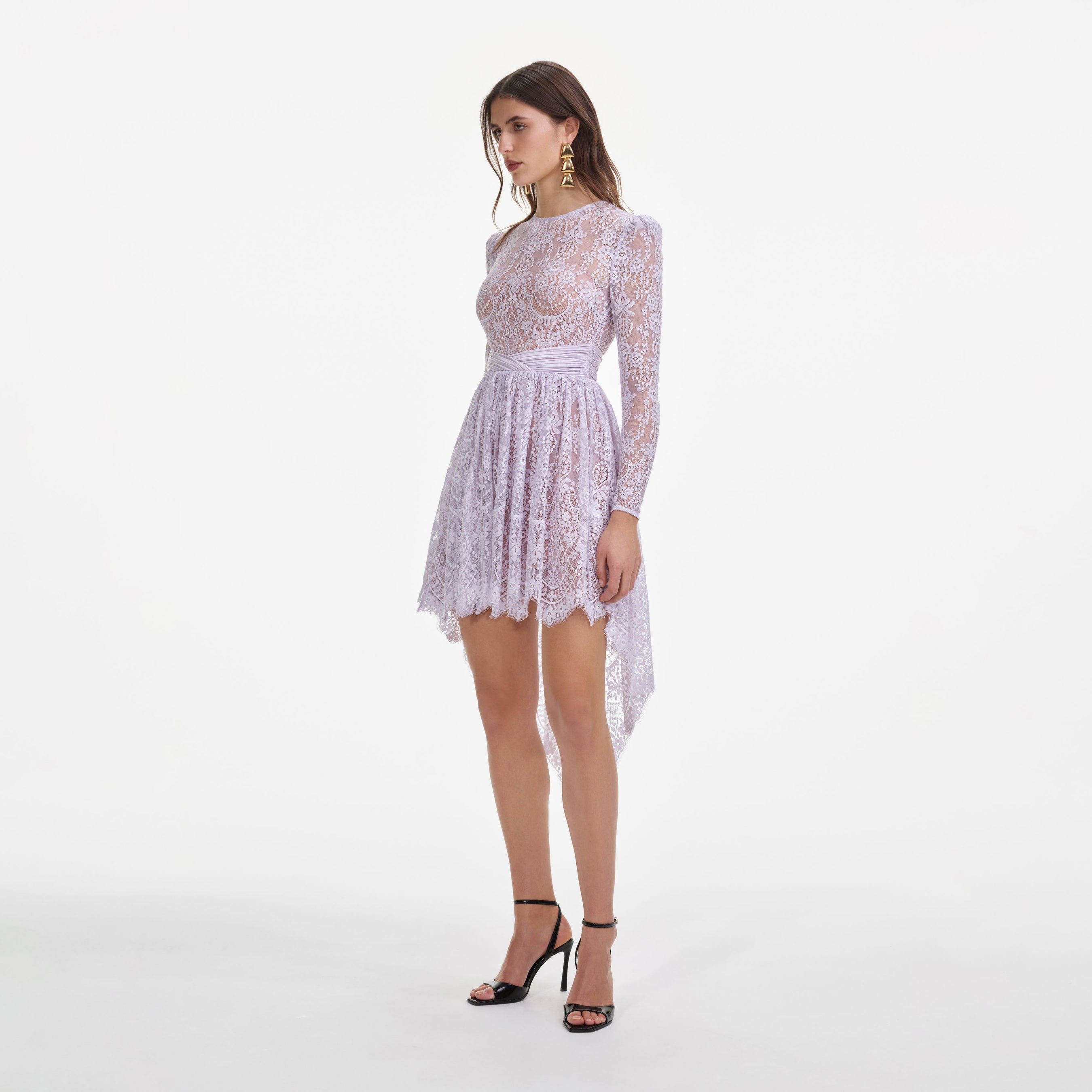 A floating dipped hem adds extra romance to this lilac lace dress. Framed by elegant long sleeves and a satin waistband, show off its dramatic skirt with heels at the next invite-only occasion.