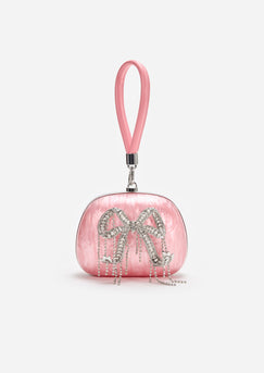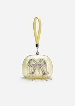 A sculptural iteration of a house signature, this pearlescent clutch features a dripping diamanté bow and embellished wrist strap. Pair with our statement earrings for the final flourish.