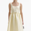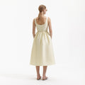 Crafted with taffeta for its shine and structure, this dress exudes classical charm. It has a flattering scoop neckline and bow-topped cinched waist, which falls to a full midi skirt.